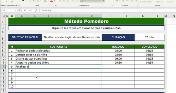 Organize seu foco em blocos de 25 minutos com pausas curtas para manter a produtividade e evitar cansaço.